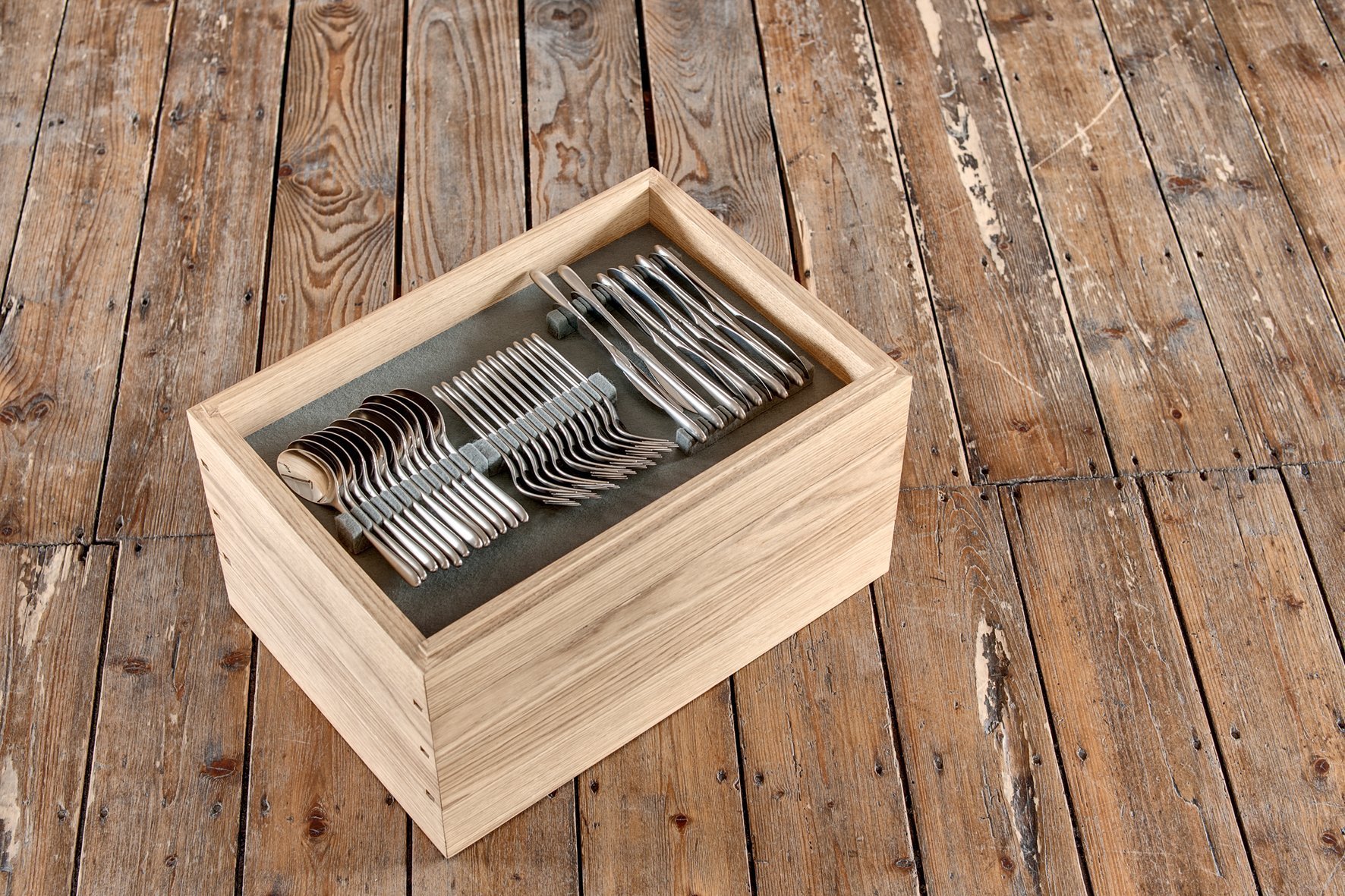 Auf den besonderen Wunsch einer Kundin hin entworfenes Möbel für die Aufbewahrung eines klassischen Bestecks.