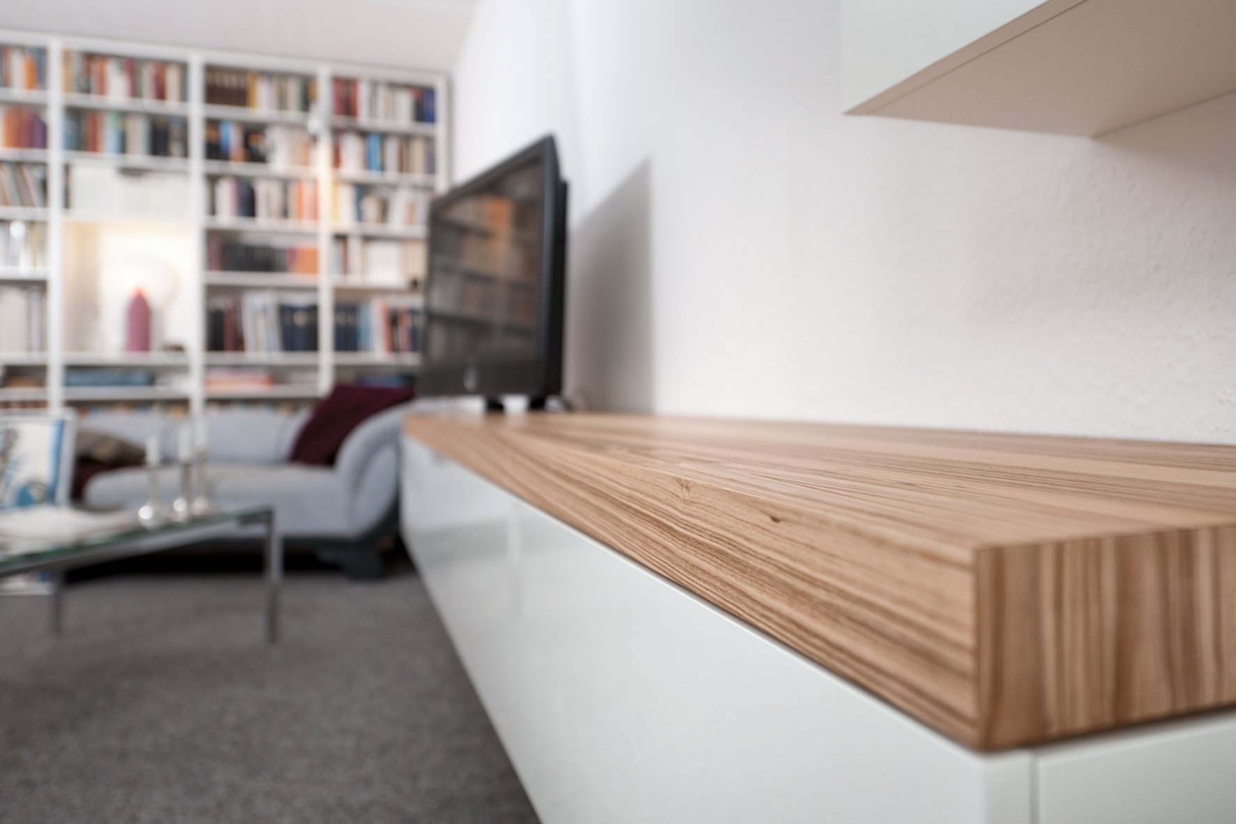 Zum Einsatz neben hochglanzlackiertem MDF kommt Eschenfurnier mit einer geölten Oberfläche.