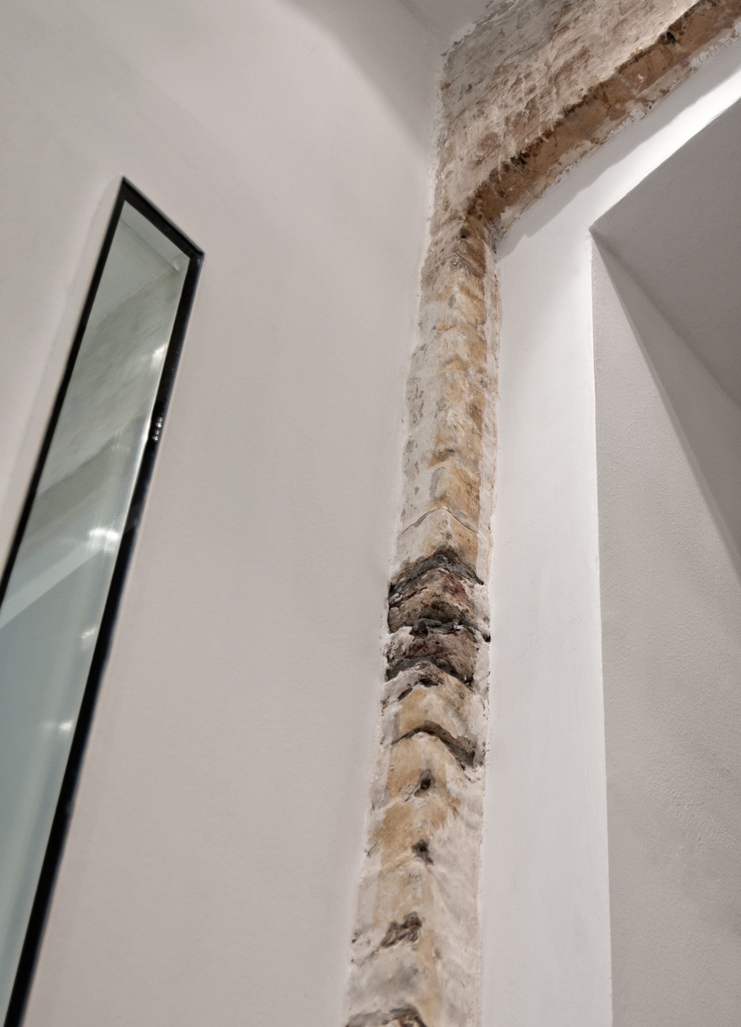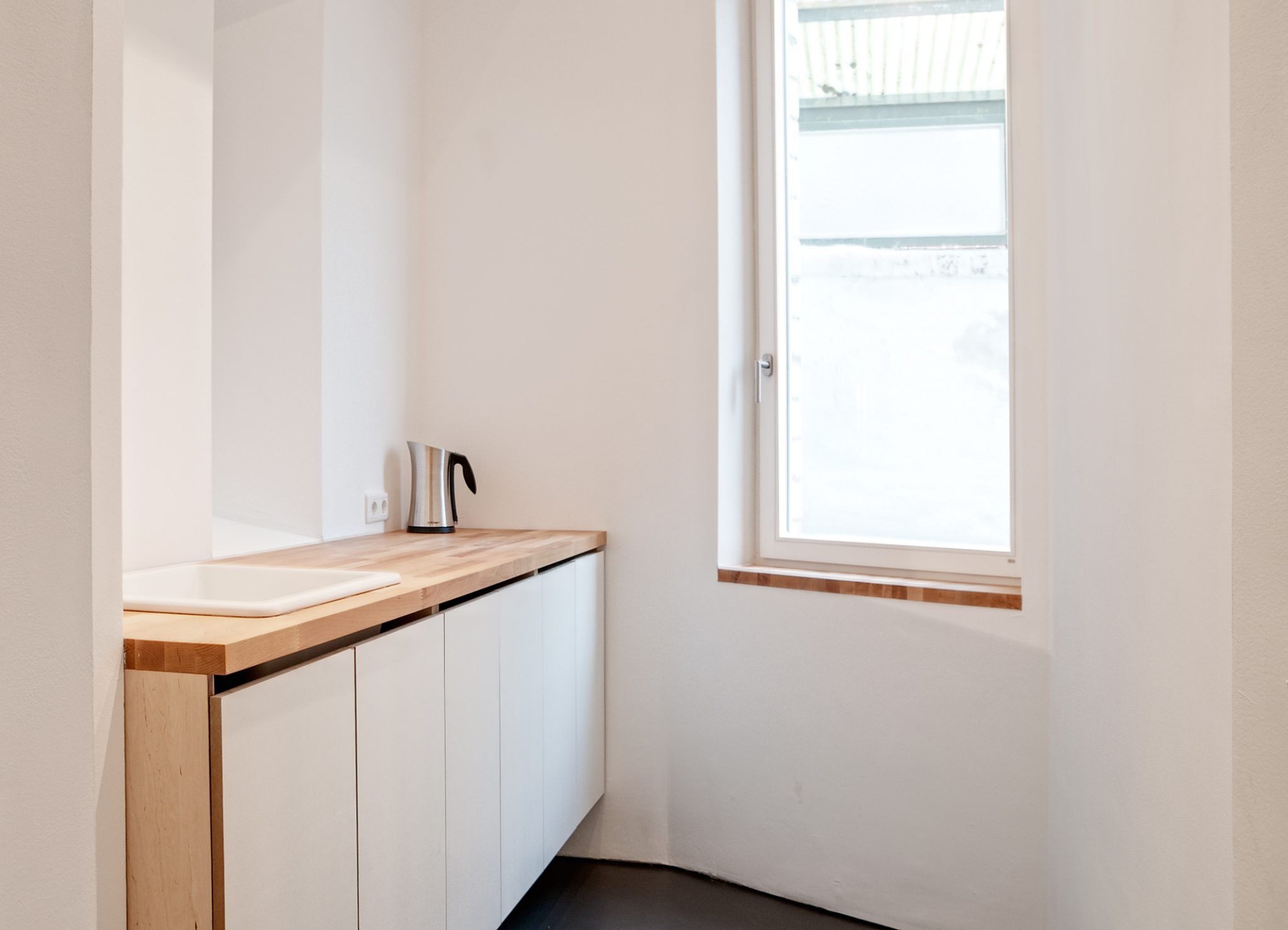 Das erste Projekt beschäftigte sich mit der Revitalisierung eines Gründerzeitbaus im Frankenberger Viertel. Die in den 1960er Jahren durchgeführten Umbaumaßnahmen eines Wohnhauses zu einer Bäckerei mit Verkaufsraum wurden rückgebaut. Die vorhandene Bestandsubstanz wurde behutsam freigelegt und wiederhergestellt. Moderne Formen ergänzen die alte Struktur. Kleine Fensternischen ermöglichen Durchblicke zu den einzelnen Nutzungszonen. Somit entsteht eine räumliche Verknüpfung, die auch kleinen Nebenräumen eine Großzügigkeit verleiht.